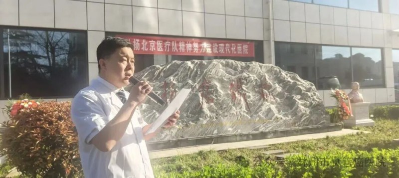 仪式上,林州市食管癌医院、姚村镇中心卫生院支部书记、院长王庆伟致辞。回望了上世纪50年代,北京医疗队专家教授,遵照周总理的指示,告别了城市优越的环境和家人,背负行李,毅然决然踏上了奔赴林州、进驻姚村、扎根太行深处的新征程,开启了一场数十载抗癌攻坚与医学求索,以医者仁心践行使命担当,以科学精神攻克医学难题,使林州食管癌发病率大大降低,让无数百姓摆脱了肿瘤折磨,重获了新生。他们为中国乃至世界食管癌防治事业作出了卓越贡献,他们在工作中形成的北京医疗队精神,将激励着一代又一代医务人员在抗癌的道路上前赴后继、砥砺前行,为肿瘤防治事业再立新功。